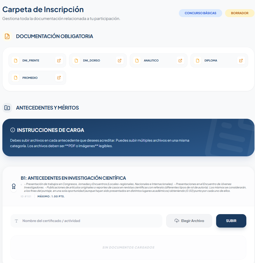Cada antecedente tiene una "leyenda" que explica qué documentación subir y qué puntaje máximo otorga.