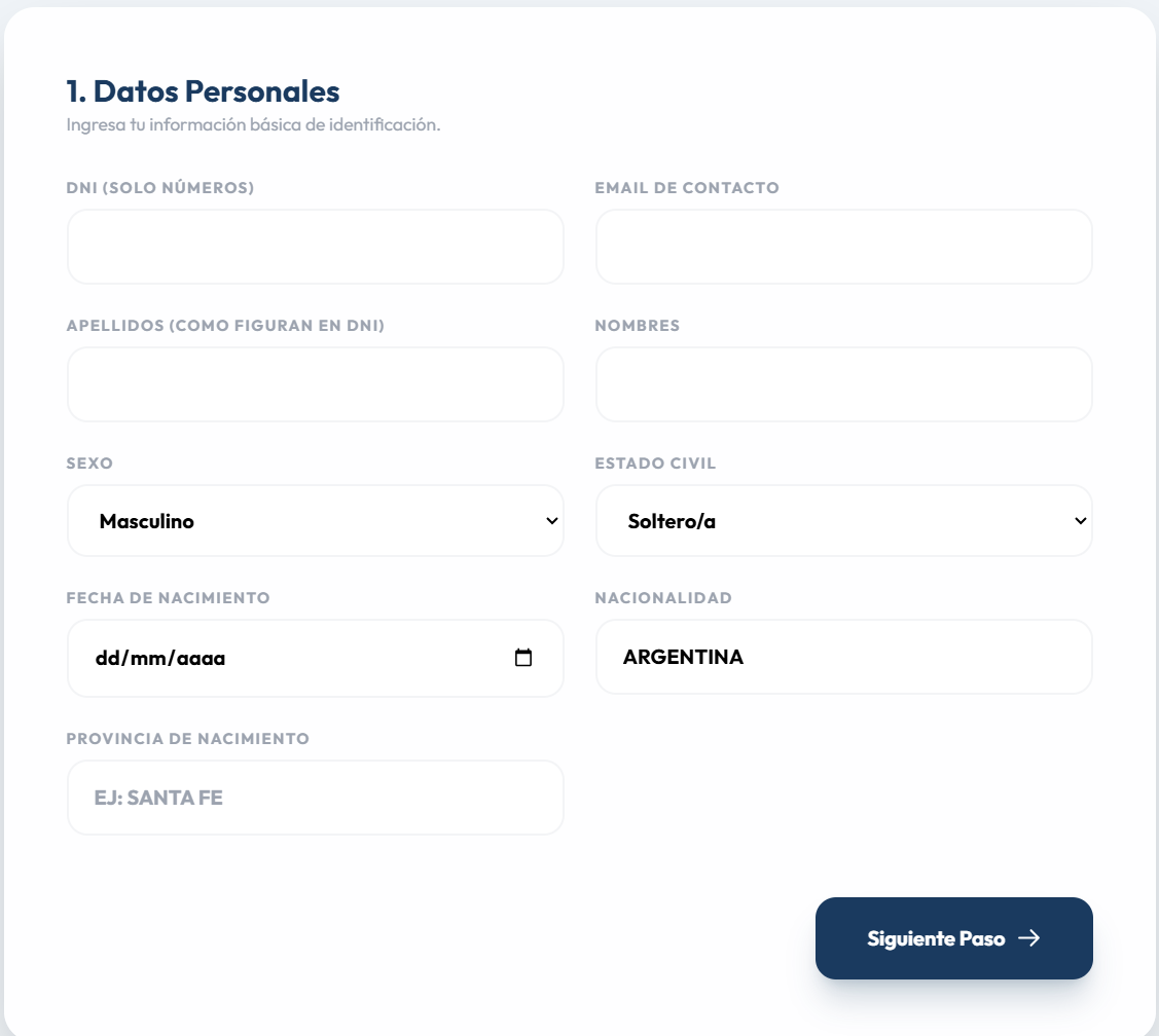 Ingresa tu información básica. Es crucial que el **DNI** sea ingresado correctamente ya que servirá como tu nombre de usuario para el resto del concurso.
