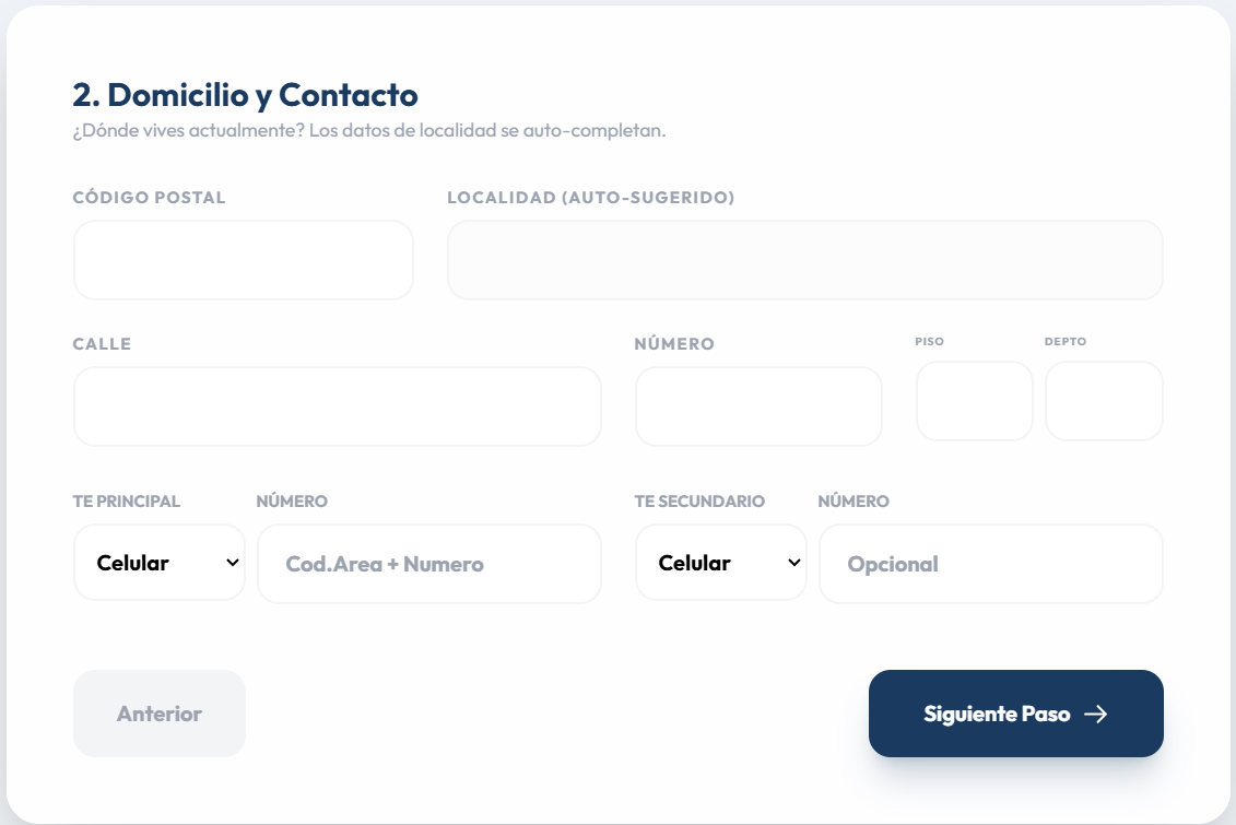 Al ingresar las primeras letras de tu localidad, el sistema te sugerirá opciones oficiales. Selecciona la que corresponda a tu domicilio real según el DNI.