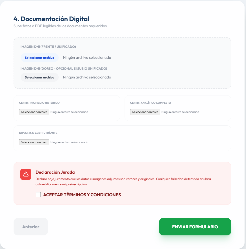 Al finalizar la carga de archivos, debes marcar la casilla de aceptación de términos y condiciones. Recuerda que este paso tiene carácter de declaración jurada.